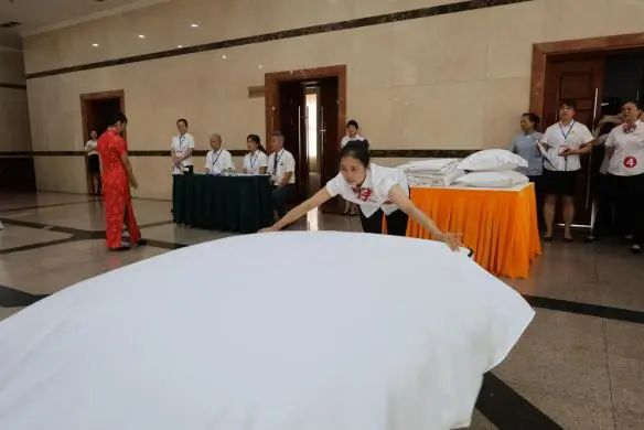 客房是宾客在酒店休憩时间最长的地方,因此客房布置是否美观尤为重要。中式铺床是一切核心的基础,员工们用娴熟的动作,甩单、定位、包角、套被罩、套枕芯等操作一气呵成,动作利落,整洁有序。
