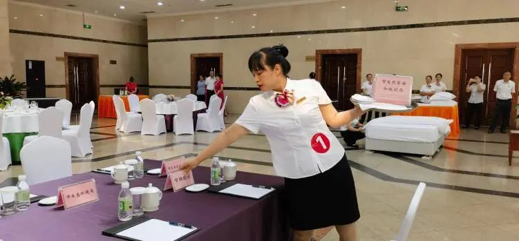 另一边,会议摆台及服务的参赛选手也不甘示弱,个个穿戴得体、举止自然大方,席位卡、小方巾、矿泉水、茶具用品、文件夹等物品摆放横竖成线,摆放角度和距离严格控制在规定内,确保每一处精准到位。茶水服务有条不紊,始终面带微笑,整个过程动作优美、流畅,服务礼仪到位,给人如沐春风之感。