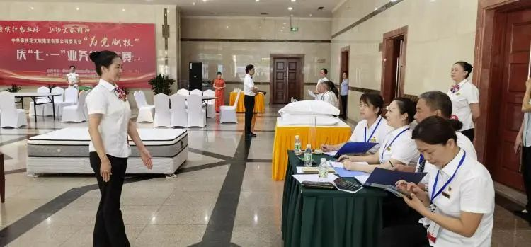 本次技能比赛采取“党建+工会”的模式,分为房中式铺床、中餐宴会摆台、会议摆台及服务3项比赛,比赛项目和内容都具有极强的实用性,是宾馆饭店服务人员必须具备的能力。经过前期推选及预赛环节,最终共有15名参赛选手进入决赛。