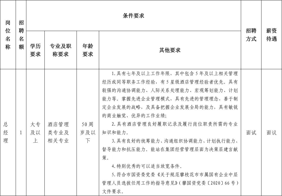 本次公开滚动招聘拟招聘攀枝花宾馆酒店有限公司总经理1名。具体条件见下: