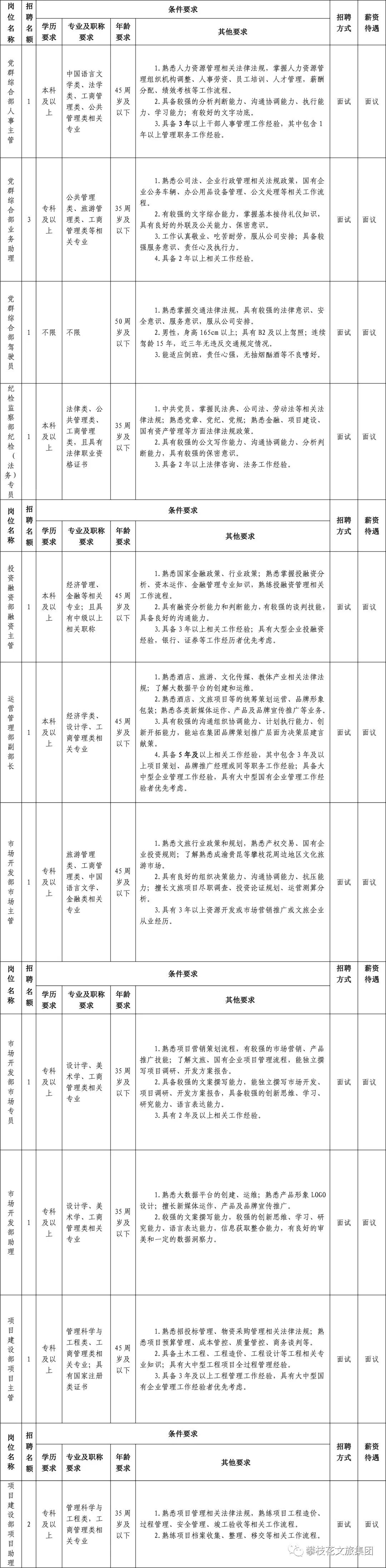 本次公开招聘拟招聘文旅集团投党群综合部人事主任1名、业务助理3名、驾驶员1名;纪检监察部纪检(法务)专员1名;运营管理部副部长1名;投资融资部融资主管1名;市场开发部市场主管1名、市场专员1名、市场助理1名;项目建设部项目主管1名、项目助理2名。具体条件见下: